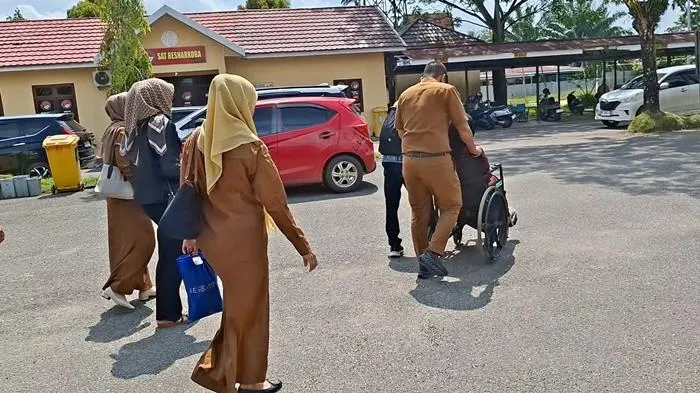 Korban yang tampak menggunakan kursi roda terlihat berada di halaman Satreskrim Polres Tapin didampingi pihak keluarga, Senin (30/3/2026).