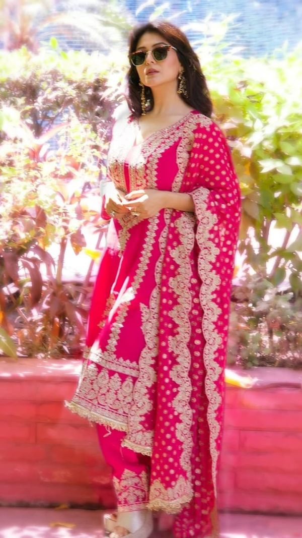 To burst firecrackers at your best friend's wedding, choose a bandhani print embroidered suit. Here is a kalidaar suit with a deep neck, where there is work on the neckline and sleeve hemline. You can get this for 3-4k.