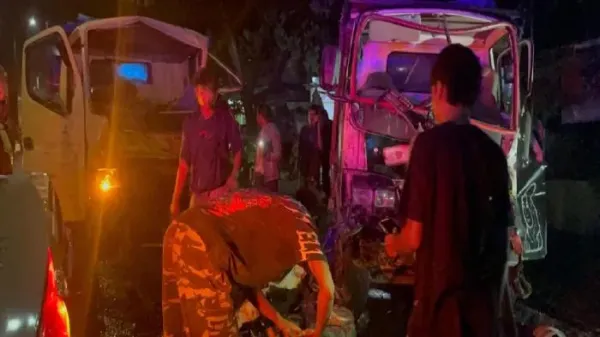 “Kedua truk itu tiba-tiba saling bertabrakan. Truk yang ambil jalur kanan menabrak bagian belakang mobil kami, sementara truk yang di kiri menabrak warung,” jelasnya.
