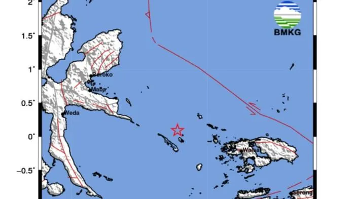 Koordinat titik gempa berada di 0.09 Lintang Utara (LU), dan 129.56 Bujur Timur (BT).